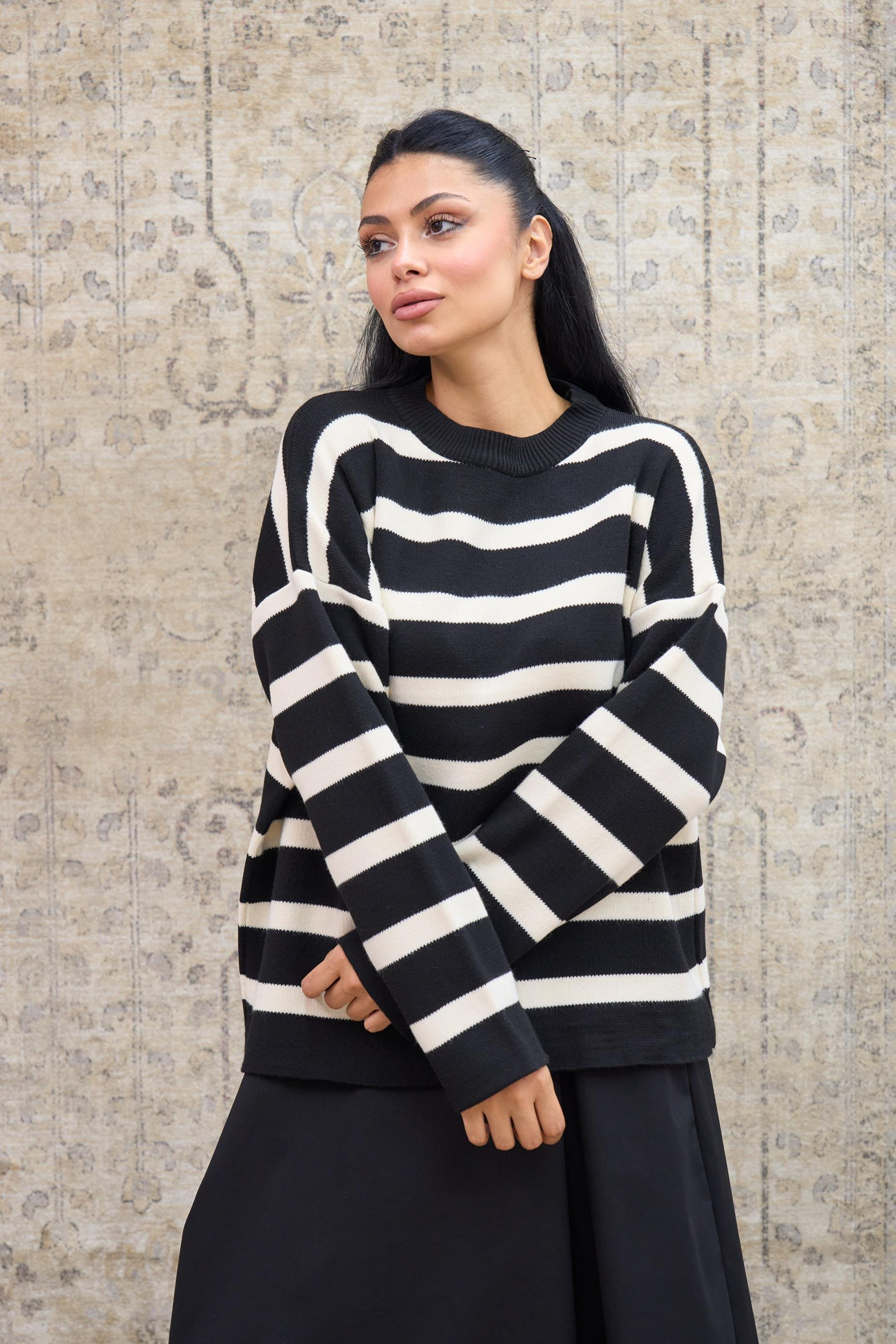 Çizgili Siyah-Krem Oversize Triko Kazak