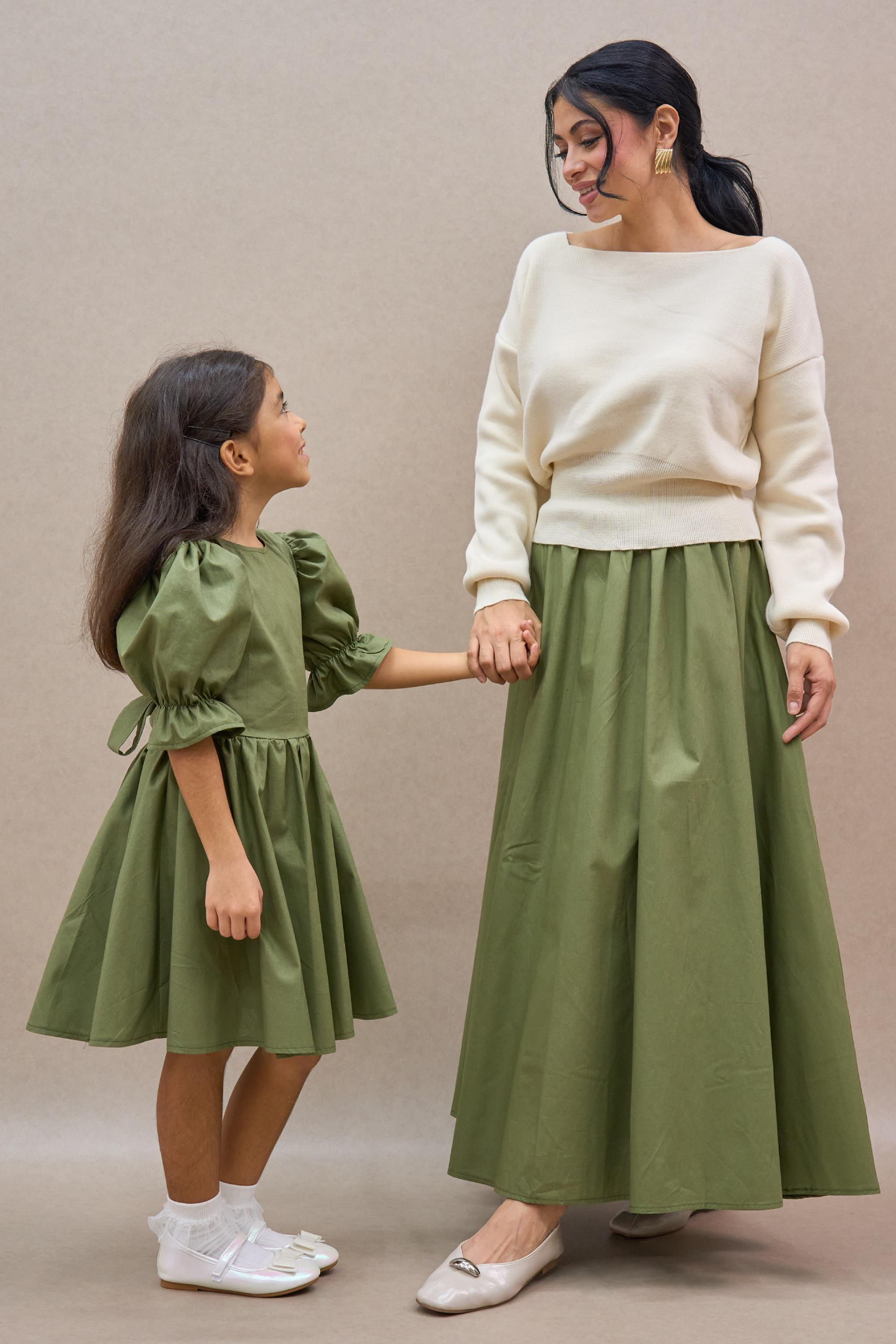 Haki Yeşil Balon Etek ve Kız Çocuk Elbise Anne-Kız Kombini (TEKLİ SATILMAKTADIR)