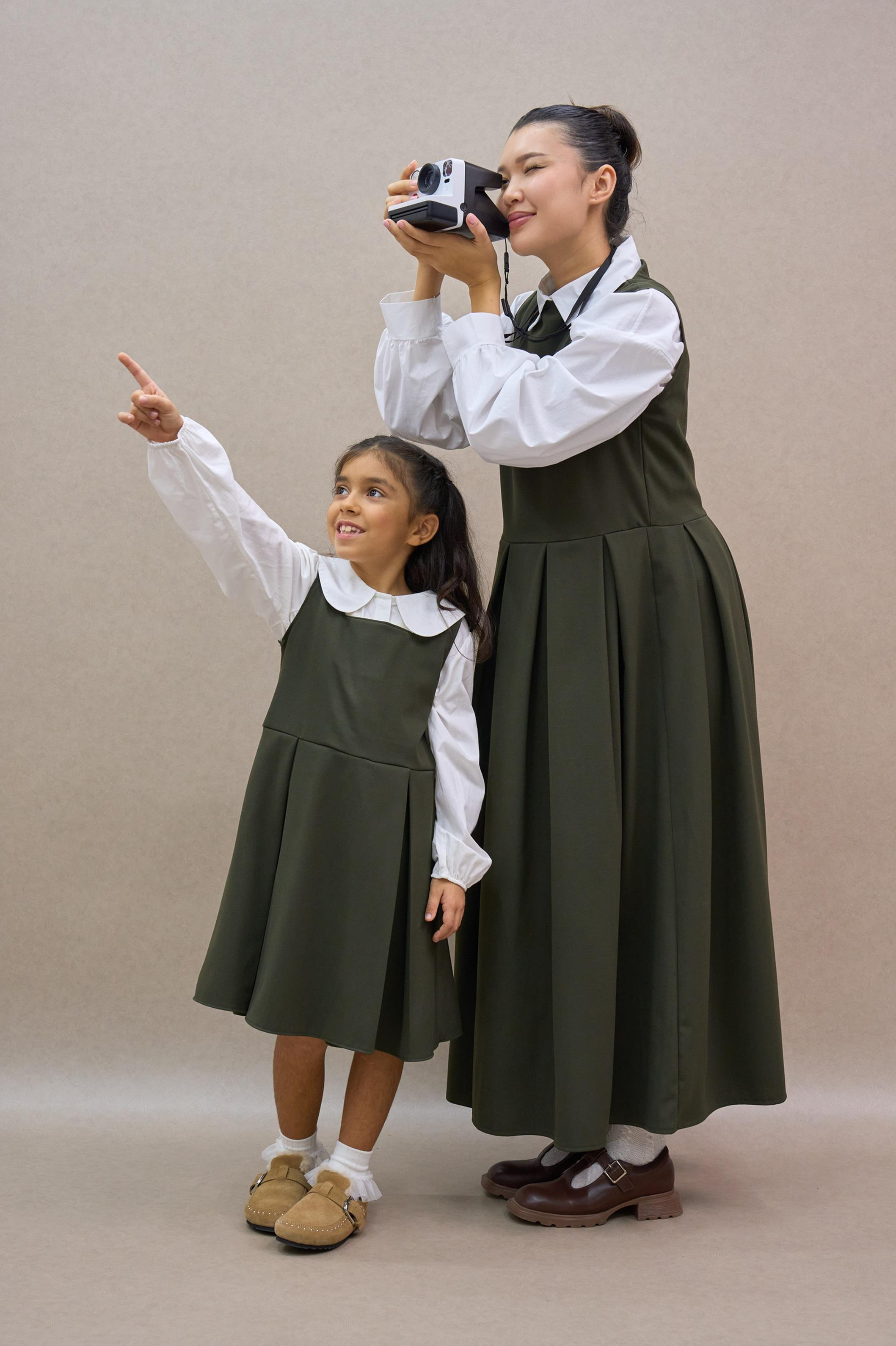 Haki Yeşil Pileli Poliviskon Jile Elbise ve Kız Çocuk Jile Elbise Anne-Kız Kombini (TEKLİ SATILMAKTADIR)