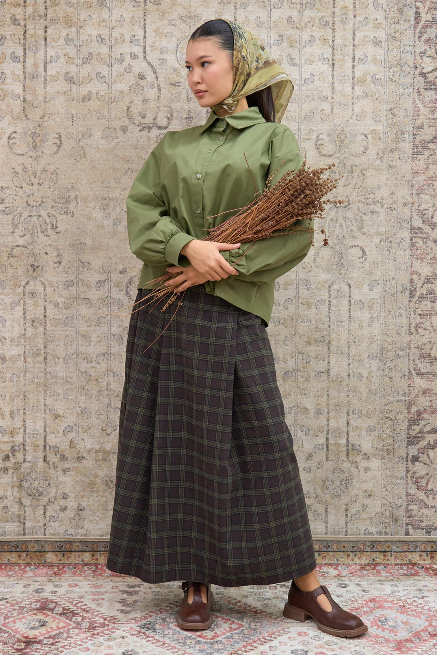 Kahve Yeşil Çizgili Ekose Pileli Etek