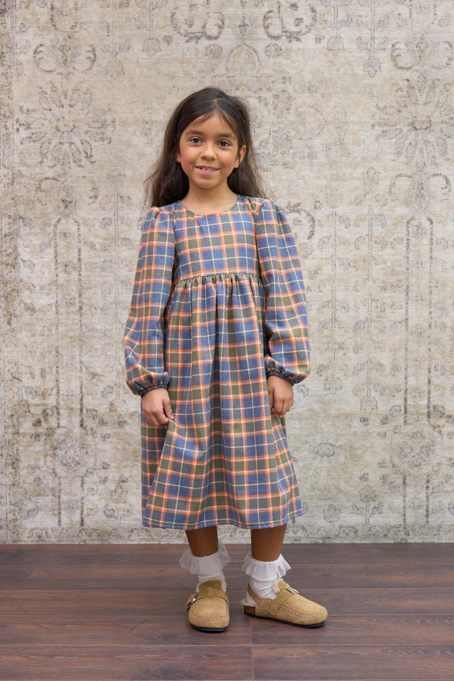 Kız Çocuk Turuncu Ekose Uzun Kollu Elbise