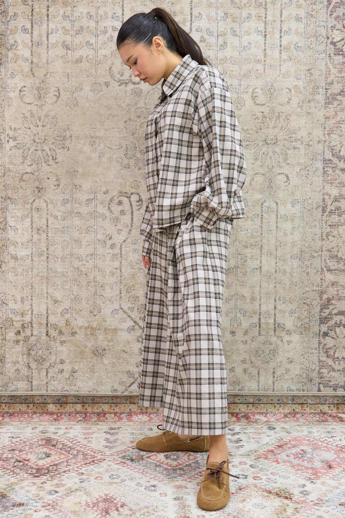 Krem Kahve Pamuklu Ekose Pileli Pantolon