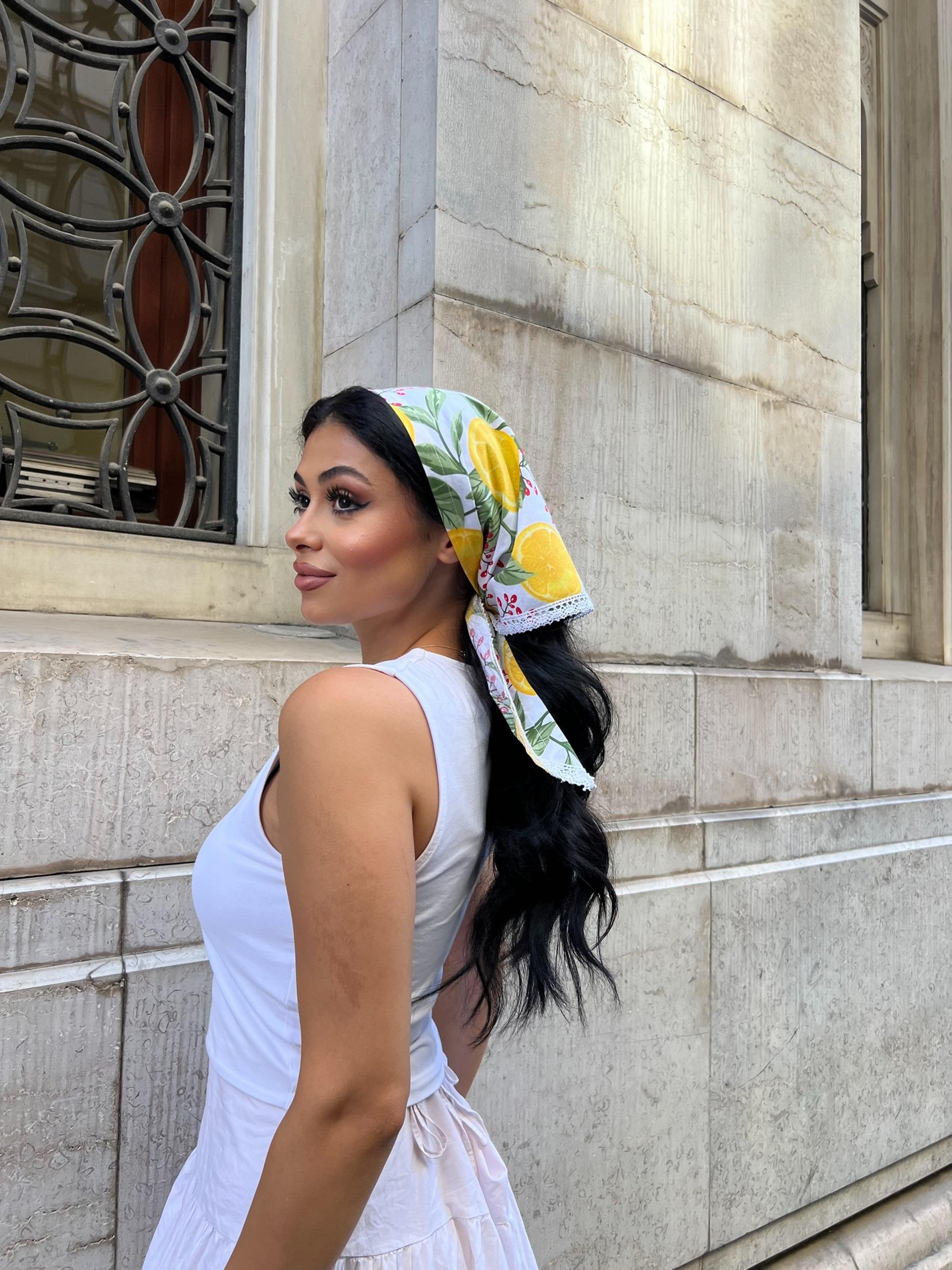 Limon Desenli Dantel Detaylı Poplin Bandana