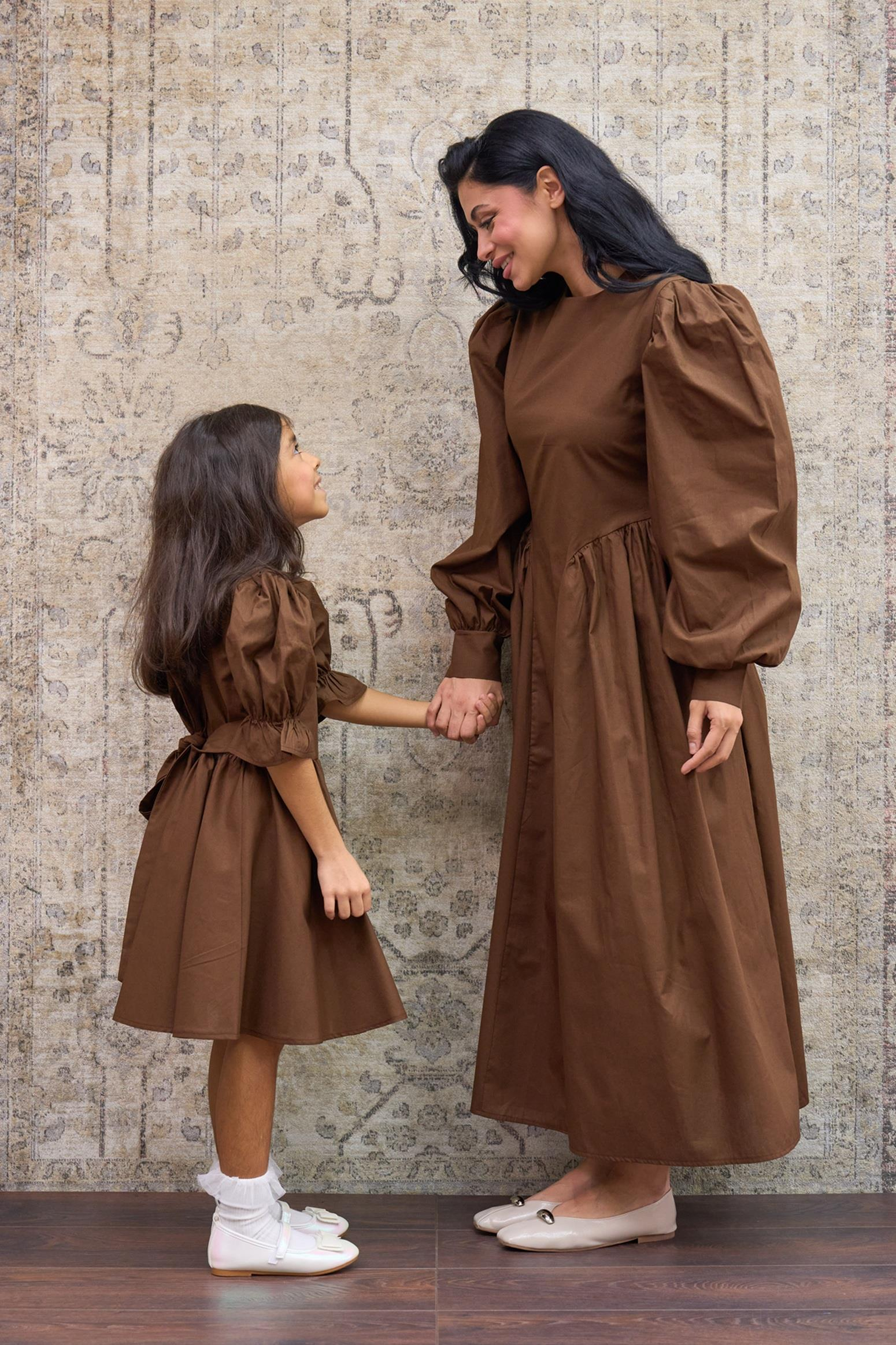 Pileli Acı Kahve Poplin Anne ve Kız Çocuk Karpuz Kol Kloş Elbise Kombini (TEKLİ SATILMAKTADIR)