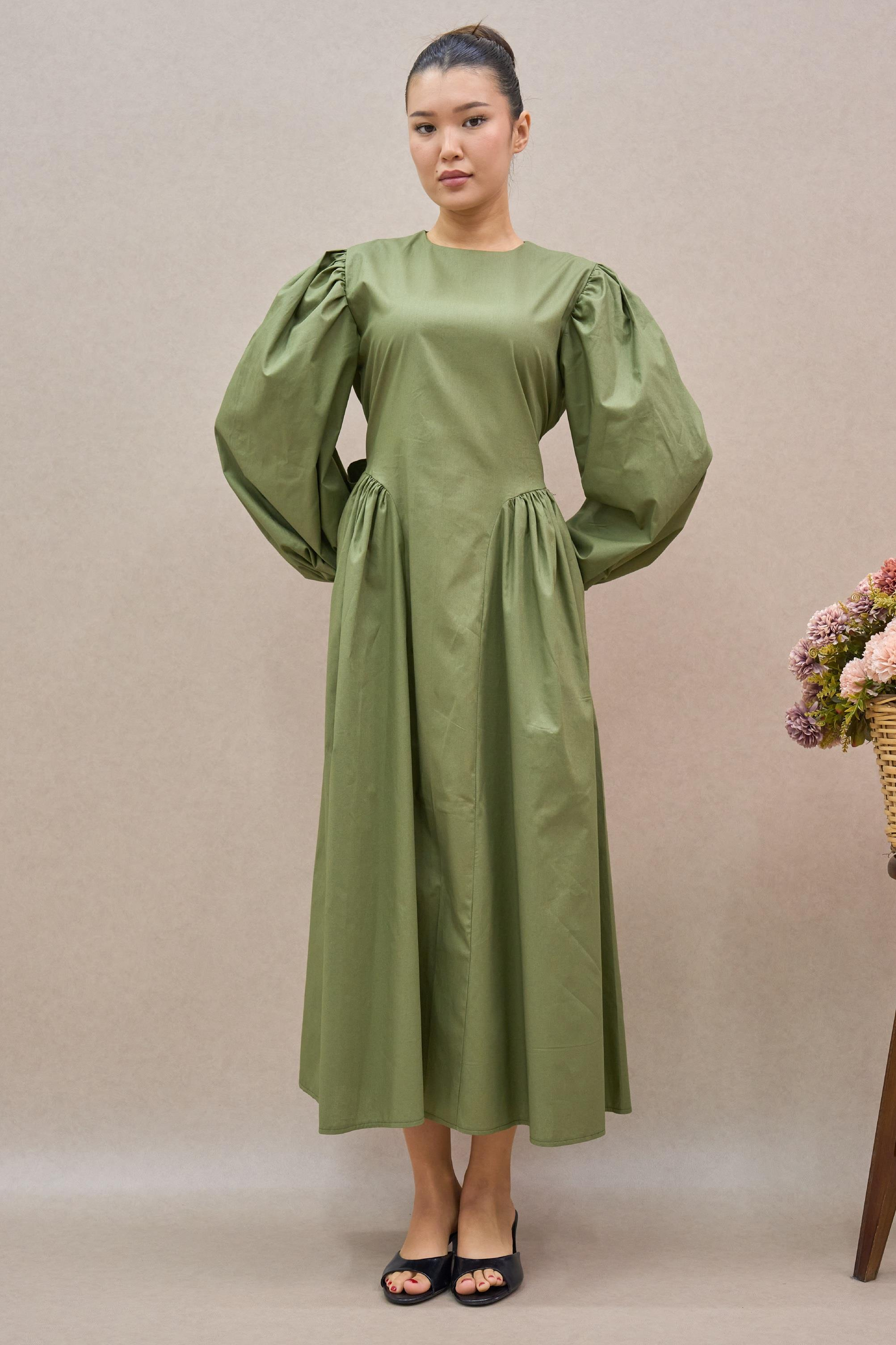 Pileli Haki Yeşil Poplin Uzun Kadın Elbise