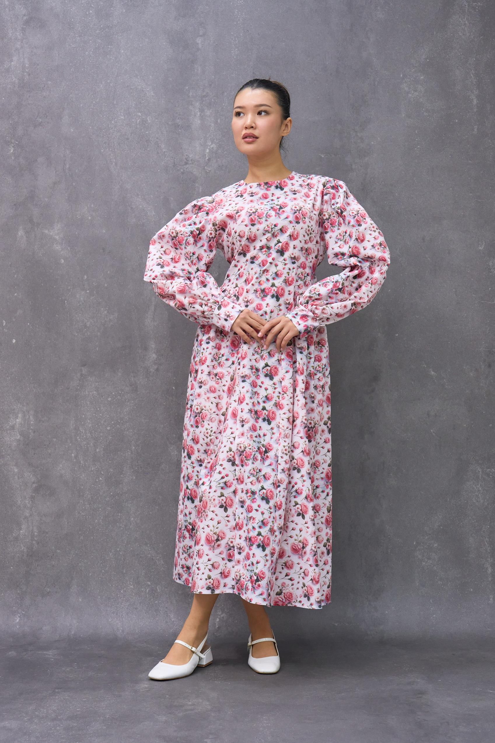 Pileli Pembe Güllü Saten Uzun Kloş Kadın Elbise