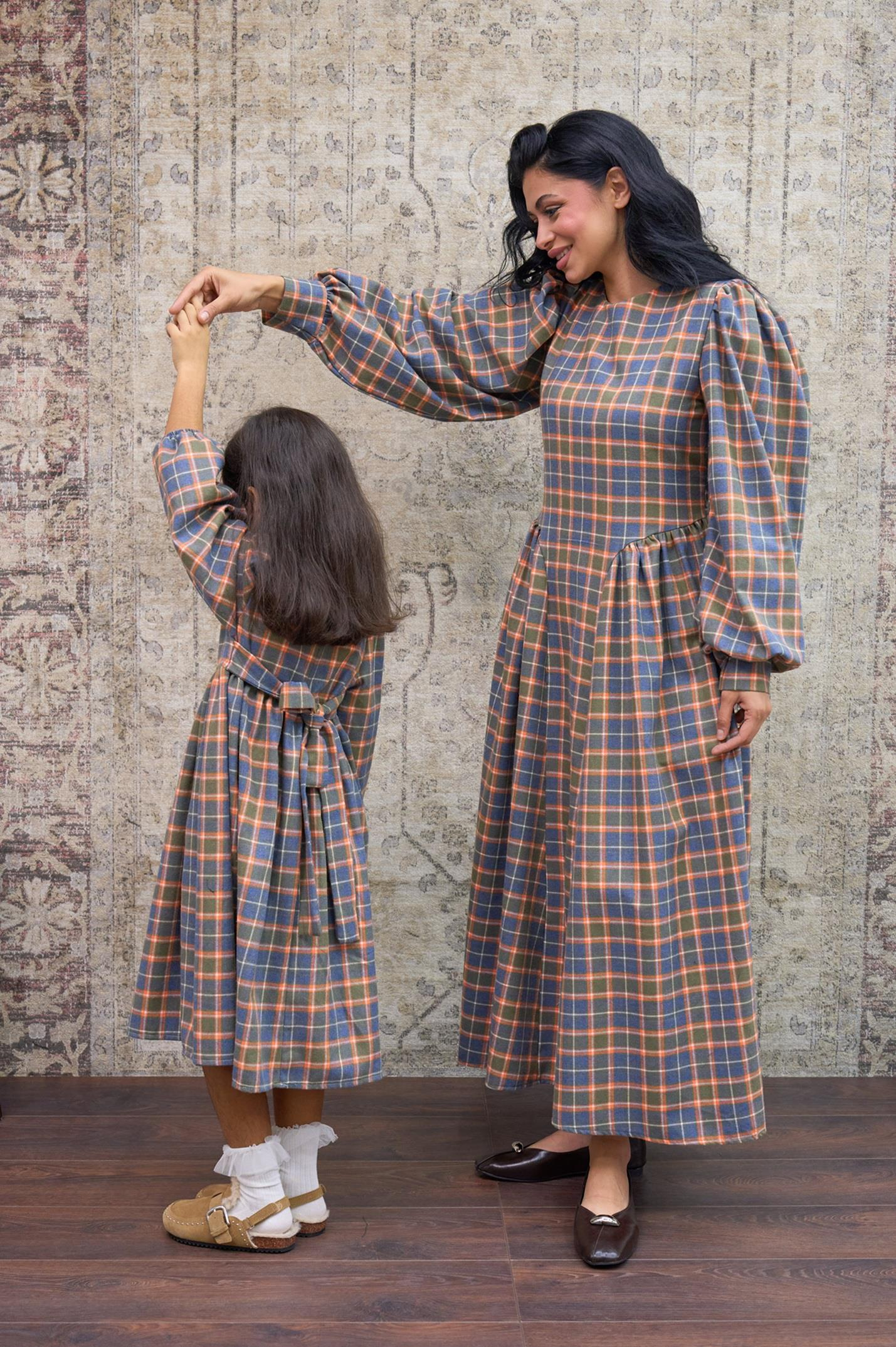 Pileli Turuncu Anne Uzun Elbise ve Kız Çocuk Uzun Kollu Ekose Elbise Anne-Kız Kombini